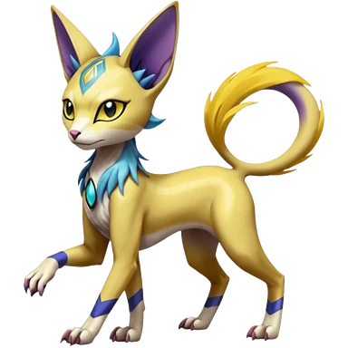 Colorful Golden-gradients Shiny smooth glossy soft elegant Meloetta-Sergal-Genet-Pokémon-Digimon-Fakémon-fusion-hybrid-creature with Cyan stripes emoji