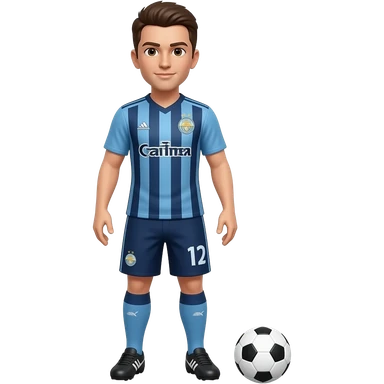 Teenage boy with light brown hair and blue eyes. Broad shoulders, slightly chubby. Wearing a soccer themed shirt and shorts outfit with matching sneakers. emoji
