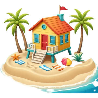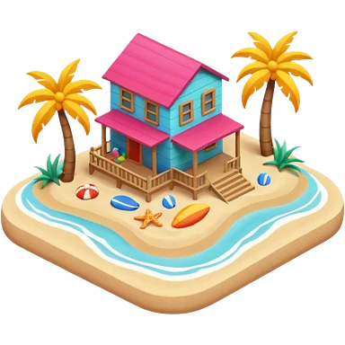 beach house near ocean, sandy ground, small waves, tropical vibe, colorful house, 3D cartoon, cute game icon, clean background, no text emoji