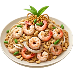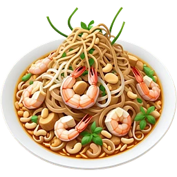 Cinematic Realistic Pad Thai Dish Emoji, depicted as stir-fried rice noodles with shrimp, tofu, peanuts, and bean sprouts rendered with vibrant textures and dynamic, appetizing lighting. emoji