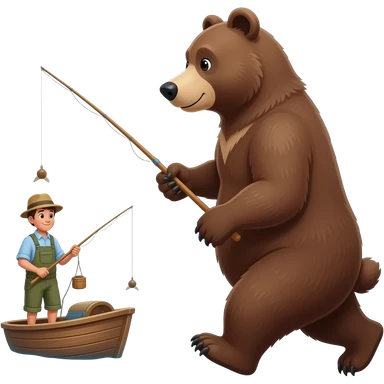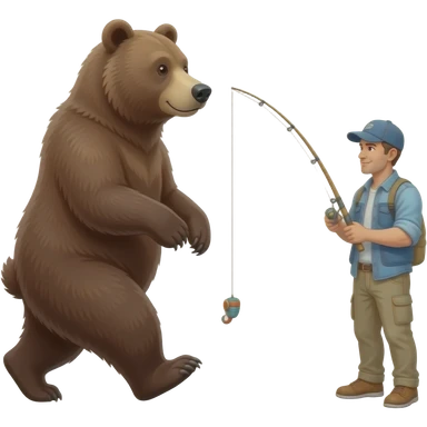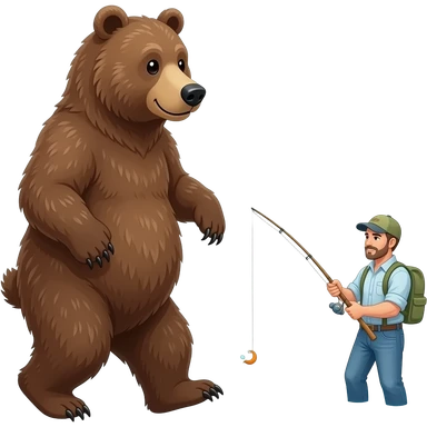 bear standing on 2 legs walking towards a man fishing in the water emoji