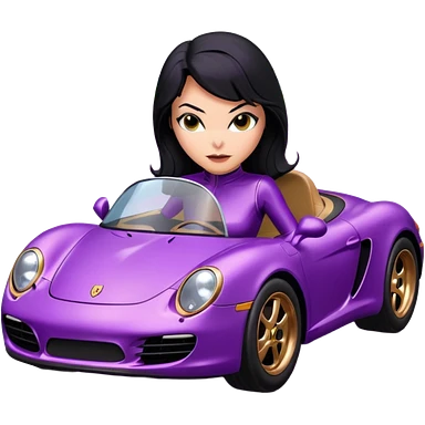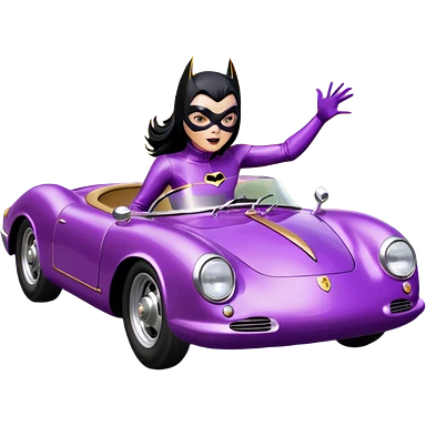 BatGirl driving her satin-black and rose gold 1956 Porsche spider too fast in the country despite the rainy conditions making the tires slippery sliding sideways and her black hair flutter (purple shiny latex catsuit) emoji