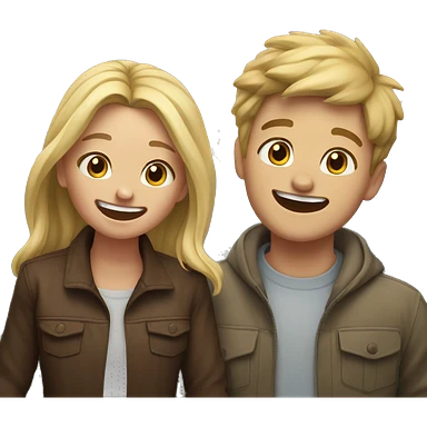 blonde girl and brown hair boy laughing infront of mountain emoji