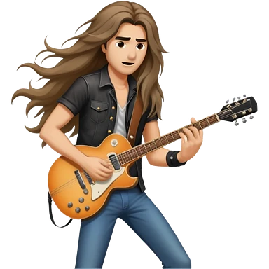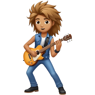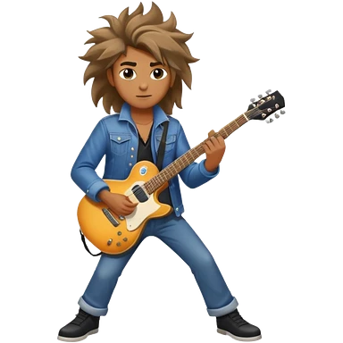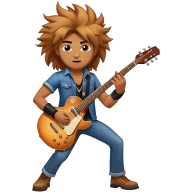 Super strong rockstar on the guitar while being shined on by a massive spotlight with his hair blowing and a cool aura emoji