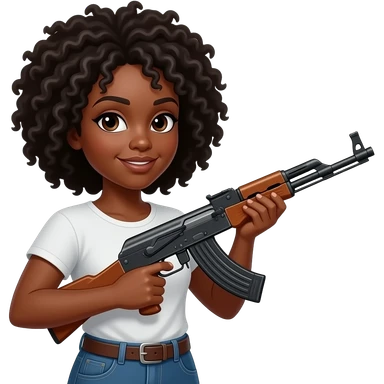 emoji of girl with an ak47 in hand with a black tank top bigger breast, smiling with teeth with maroon dark long hair in a middle part with straight nose hazel eyes medium perfect eye brows with a nose ring silver on the right nostril emoji