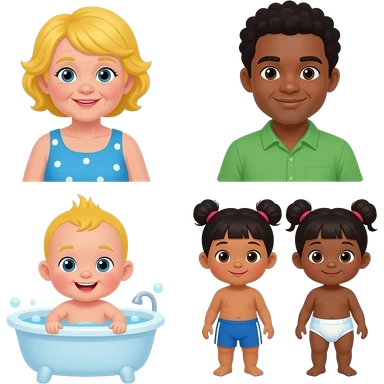 The baby in the bath One yellow hair old woman With blue dress one baby yellow spiky hair And swim shorts one Afro hair Brown skin man And green shirt One baby Dark Skin Afro Hair And swim shorts Two Babies Asian Girl With Upper Ponytails One Baby Dark skin Afro Girls Hair And diapers emoji