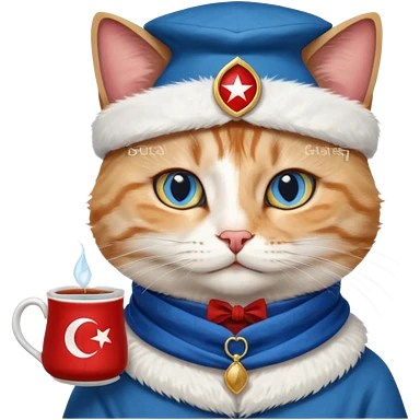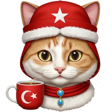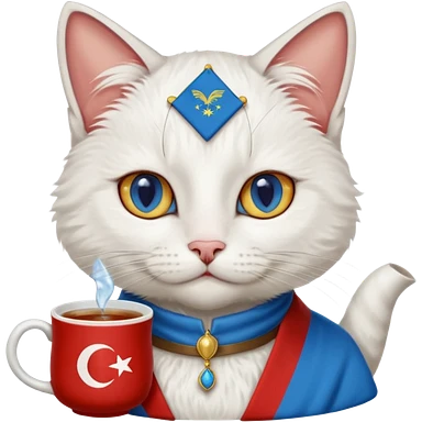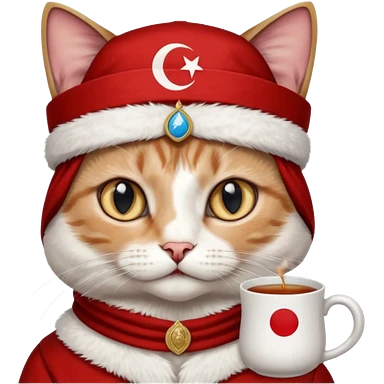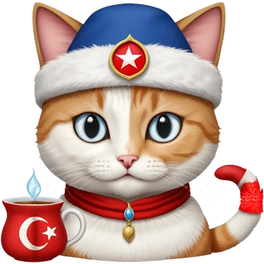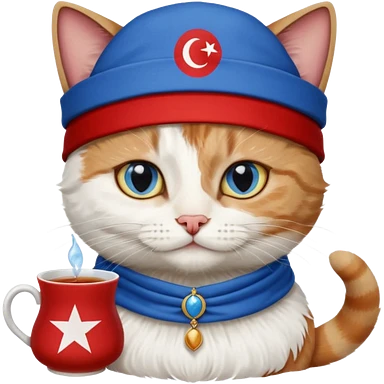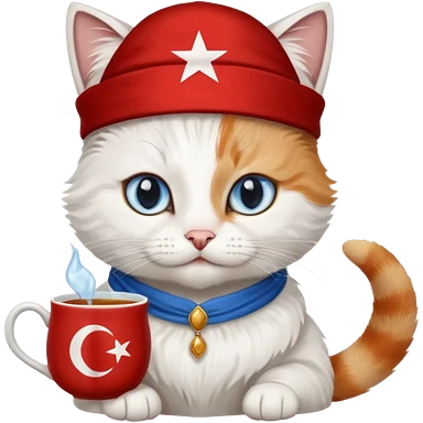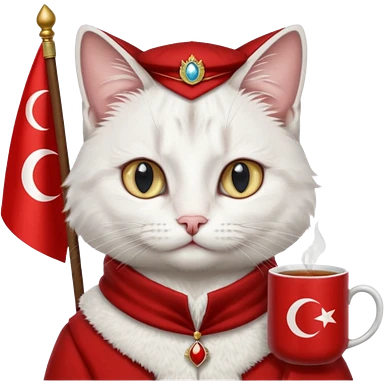 Arkasında Türk bayrağı olan ve çay içen kafasına fes takan bir van kedisi emoji