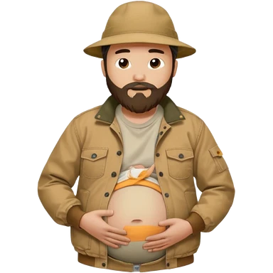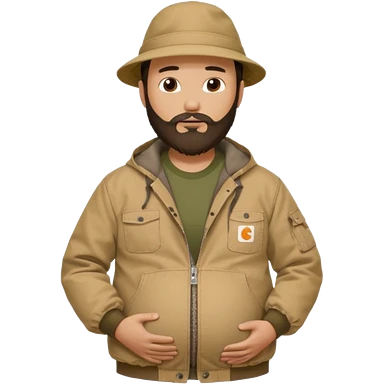 Bearded man rubbing pregnant belly poking out of shirt wearing a tan canvas carhartt jacket with chinese hat on emoji