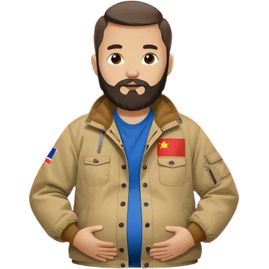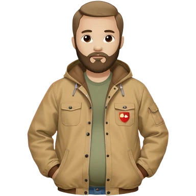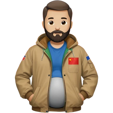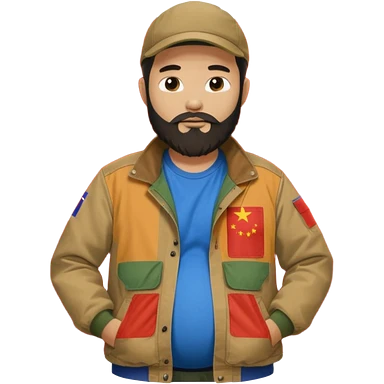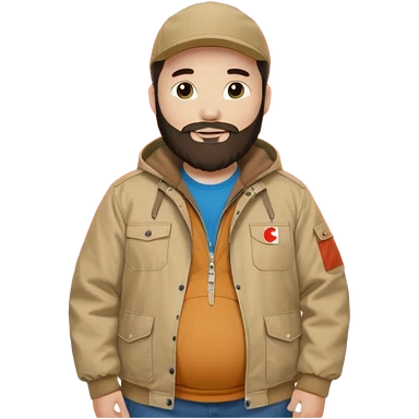 Bearded man with pregnant belly poking out of shirt wearing a tan canvas carhartt jacket next to chinese flag emoji