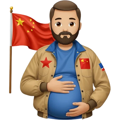 Bearded man rubbing pregnant belly poking out of a chinese flag shirt wearing a tan canvas carhartt jacket emoji