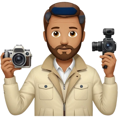 Middle-age male, brown beard and hair, holding camera, off white jacket emoji