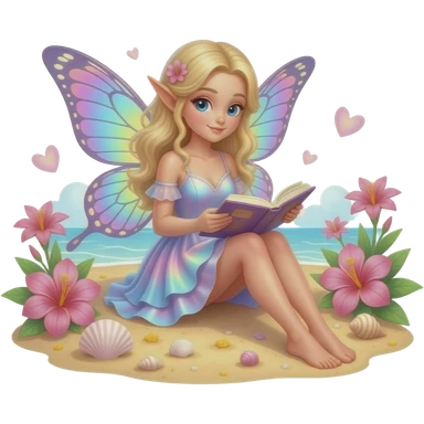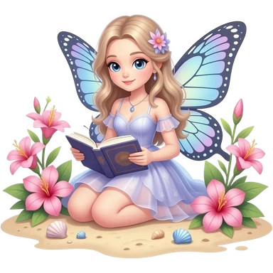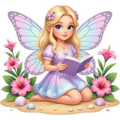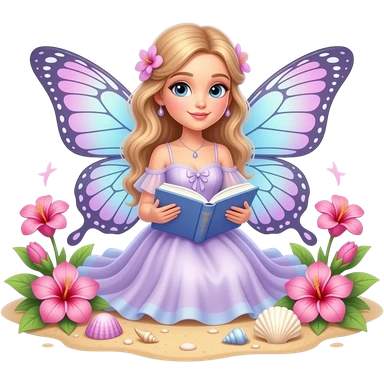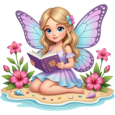 Beautiful fairy with butterfly wings reading a book on the beach, surrounded by pink tropical flowers, seashells, and soft pastel fantasy details Beautiful fairy with butterfly wings reading a book on the beach, surrounded by pink tropical flowers, seashells, and soft pastel fantasy details emoji