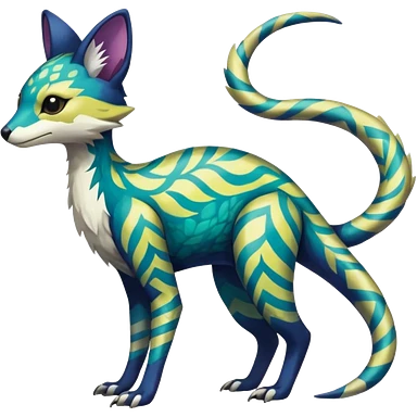 beautiful shiny patterned marked handsome gorgeous aesthetic colorful vibrant Vernid-Trico-species-Fakemon-creature by LiLaiRa, 4 legs, 1 tail, random markings, (full body) emoji