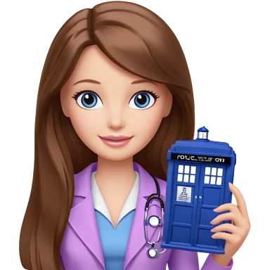 beautiful barbie girl with long brown hair, blue eyes and wearing light purple clothes watching dr who on tv emoji | AI Emoji Generator