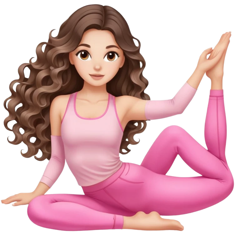 beautiful brunette with a light balayage white girl with nice defined and long curls , very long hair, clean girl makeup STRETCHING IN LIGHT PINK GYM emoji | AI Emoji Generator