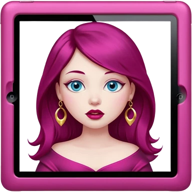 Realistic Beautiful pale skin baby blue sparkling eyes, plump red lips with gold lip ring, dark long burgundy hair, appears to be creating artwork on her fuchsia pink ipad emoji