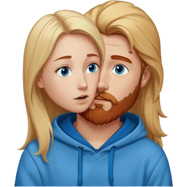 Long-pale-blonde hair, beautiful girl with blue eyes-wearing a light blue hoodie, facing, kissing reddish-brown hair-beard boy blue eyed white guy emoji