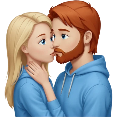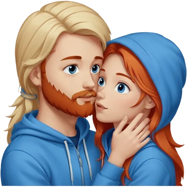 Long-pale-blonde hair, beautiful girl with blue eyes-wearing a light blue hoodie, facing, kissing red-brownish hair-beard boy blue eyed white guy emoji