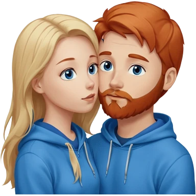 Long-pale-blonde hair, beautiful girl with blue eyes-wearing a light blue hoodie, facing, kissing reddish-brownish hair and beard boy blue eyed white guy in a dark blue hoodie emoji