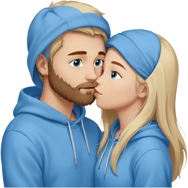 Long-pale-blonde hair, beautiful girl with blue eyes-wearing a light blue hoodie, facing, kissing brownish hair and beard boy blue eyed white guy emoji