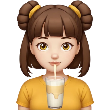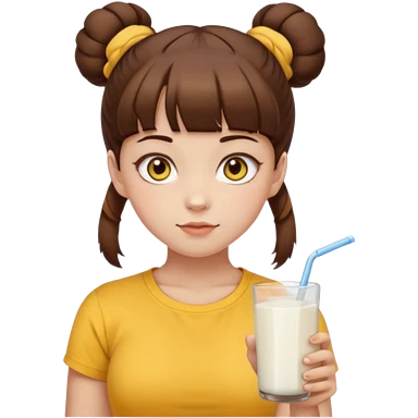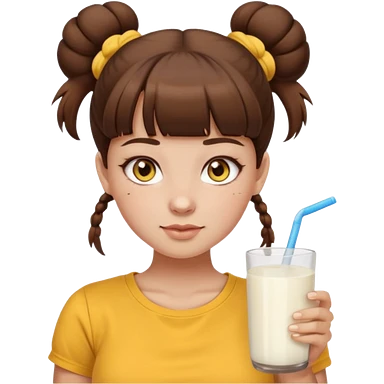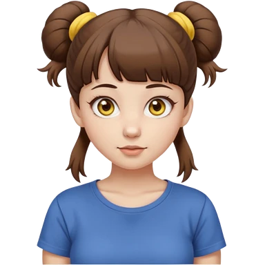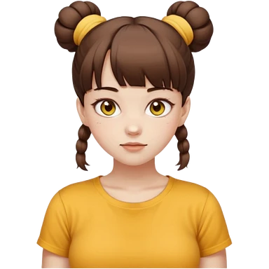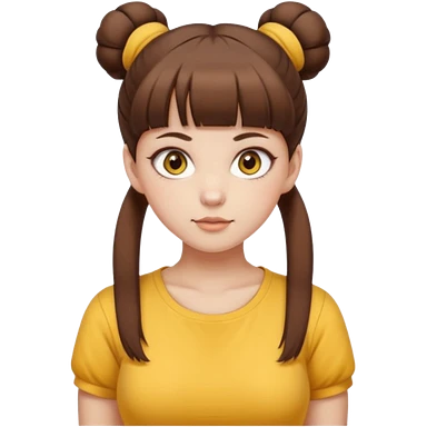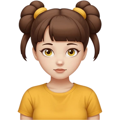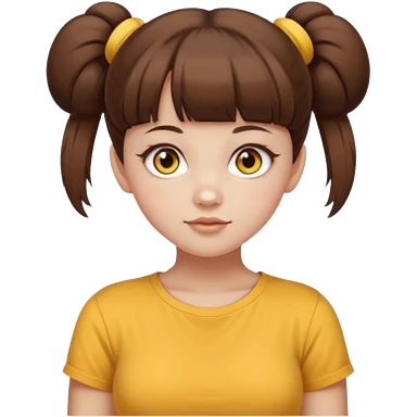 beautiful girl with brown hair with up twin buns style only, straight bangs, yellow eyes, milk brown tshirt, white skin, her body is a little fat emoji | AI Emoji Generator