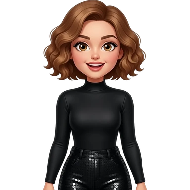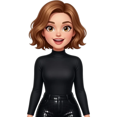 glamours,-tanned,-very-beautiful-girl,-with-big-pump-peach-beige-rose-lips,-long-long-lashes,-honey-silky-very short- hair,-wavy-hair,-hazel-eyes-in-black-long-sleeves-bodysuit-black sequinned pants-excited happy- from waist up. emoji