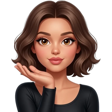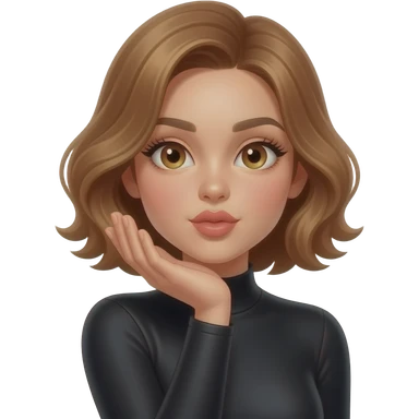glamours,-tanned,-very-beautiful-girl,-with-big-pump-peach-beige-rose-lips,-long-long-lashes,-honey-silky-very short- hair,-wavy-hair,-hazel-eyes-in-black-long-sleeves-bodysuit- blowing a kiss with her hand emoji