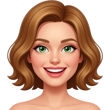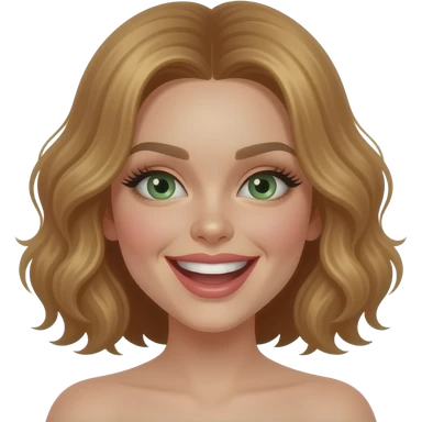 white, very beautiful woman, with big plump lips, long long lashes, honey wavy short hair, green eyes, laughing emoji