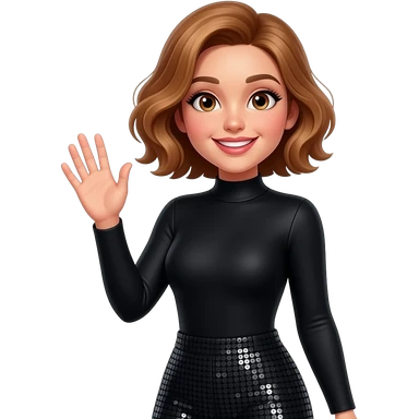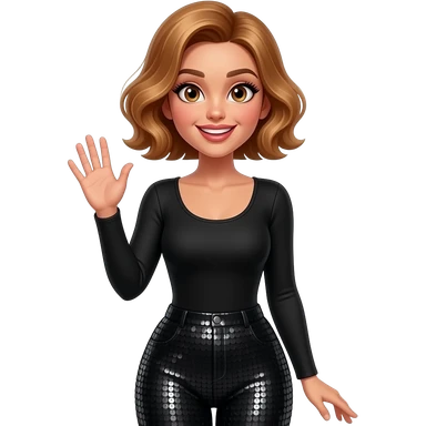 glamours,-tanned,-very-beautiful-girl,-with-big-pump-peach-beige-rose-lips,-long-long-lashes,-honey-silky-very short- hair,-wavy-hair,-hazel-eyes-in-black-long-sleeves-bodysuit-black sequinned pants- waving- happy- from waist up. emoji