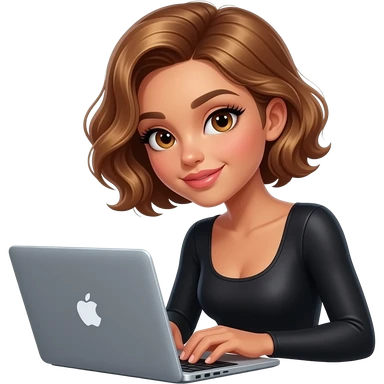 glamours,-tanned,-very-beautiful-girl,-with-big-pump-peach-beige-rose-lips,-long-long-lashes,-honey-silky-very short- hair,-wavy-hair,-hazel-eyes-in-black-long-sleeves-bodysuit- typing on her apple mac laptop emoji