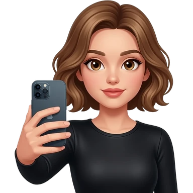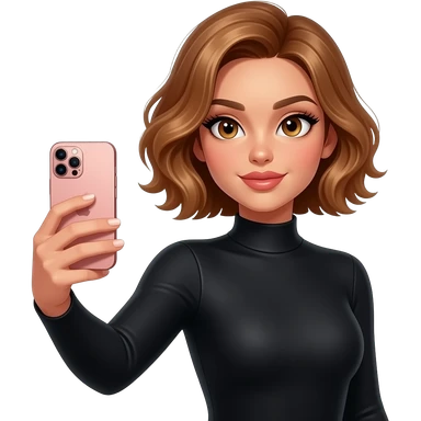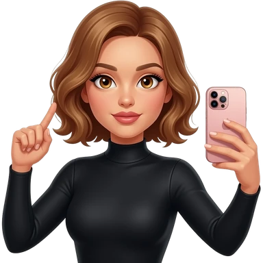 glamours,-tanned,-very-beautiful-girl,-with-big-pump-peach-beige-rose-lips,-long-long-lashes,-honey-silky-very short- hair,-wavy-hair,-hazel-eyes-in-black-long-sleeves-bodysuit- taking a selfie with her iPhone 16promax emoji