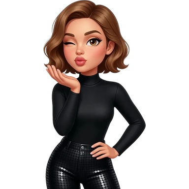 glamours,-tanned,-very-beautiful-girl,-with-big-pump-peach-beige-rose-lips,-long-long-lashes,-honey-silky-very short- hair,-wavy-hair,-hazel-eyes-in-black-long-sleeves-bodysuit-black sequinned pants- blowing a kiss off her hand- winking-sensually- from waist up. emoji