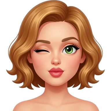 white, very beautiful woman, with big plump lips, long long lashes, honey wavy short hair, green eyes, winking and blowing a kiss emoji