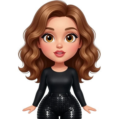 glamours,-tanned,-very-beautiful-girl,-with-big-pump-peach-beige-rose-lips,-long-long-lashes,-honey-silky-very short- hair,-wavy-hair,-hazel-eyes-in-black-long-sleeves-bodysuit-black sequinned pants-excited - from waist up. emoji