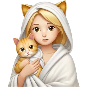 A beautiful woman wrapped in a blanket after taking a bath hugs a white cat emoji