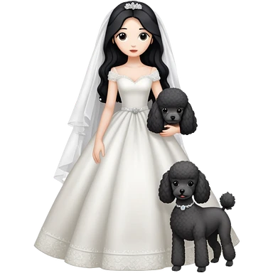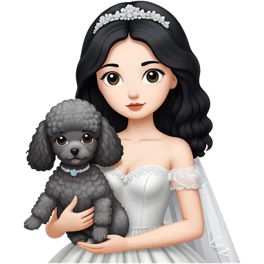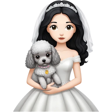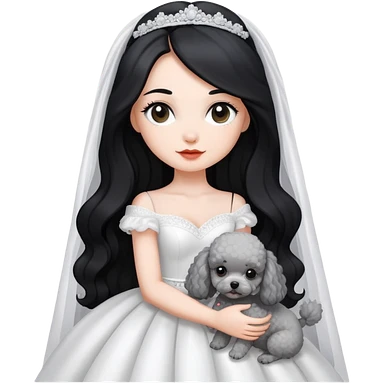 A beautiful girl with long black hair in a wedding dress holds a small gray poodle emoji