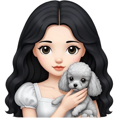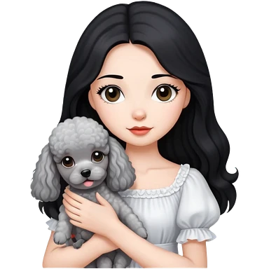 beautiful girl with long black hair in a white dress holding a small gray poodle emoji
