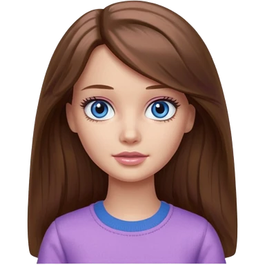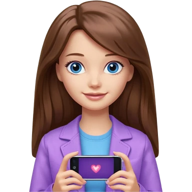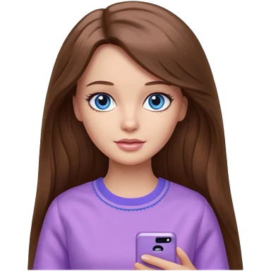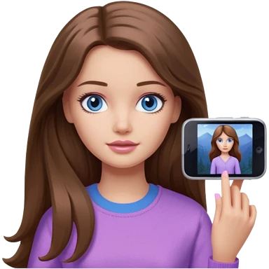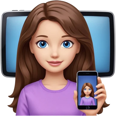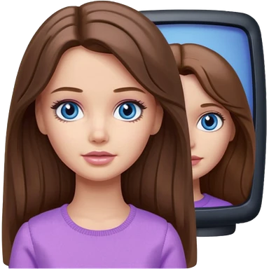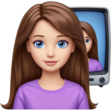 beautiful barbie girl with long brown hair, blue eyes and wearing light purple clothes watching tv shows emoji
