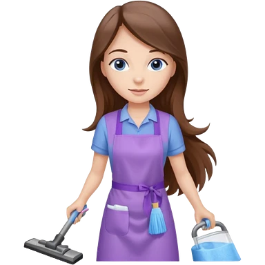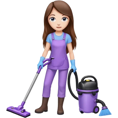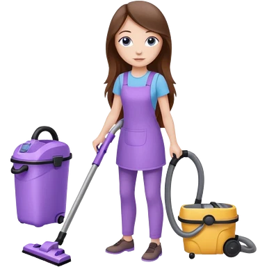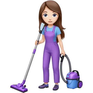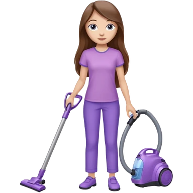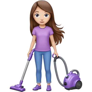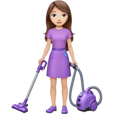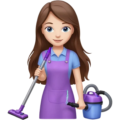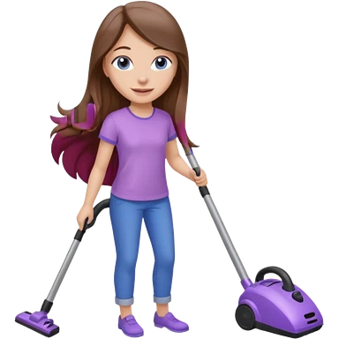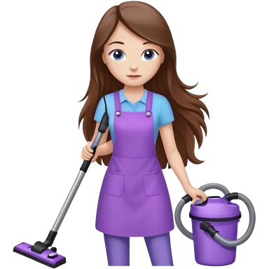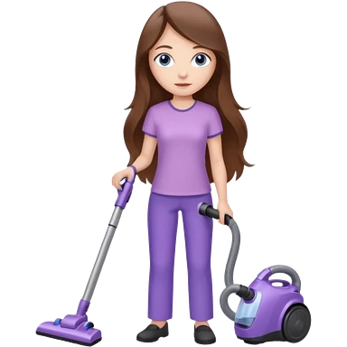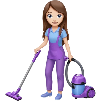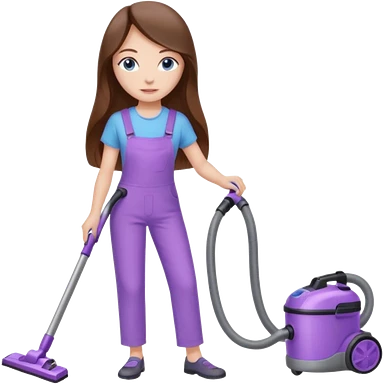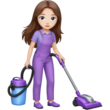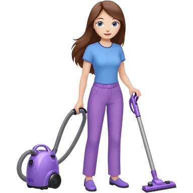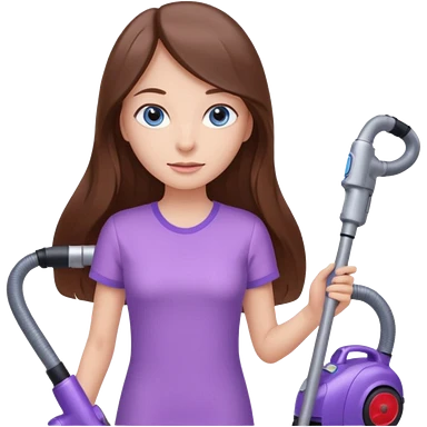 beautiful girl with long brown hair, blue eyes and wearing light purple clothes, cleaning and vacuuming emoji