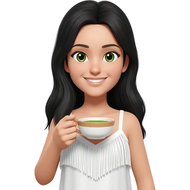 beautiful woman curtain fringe 30 years white skin drink matcha black long hair green and brown eyes white dress and smile emoji