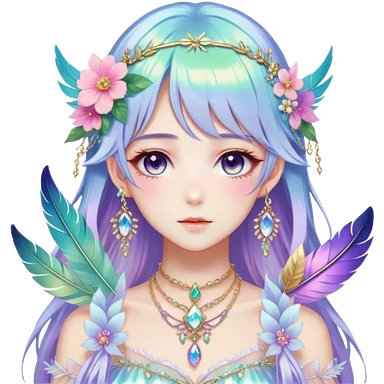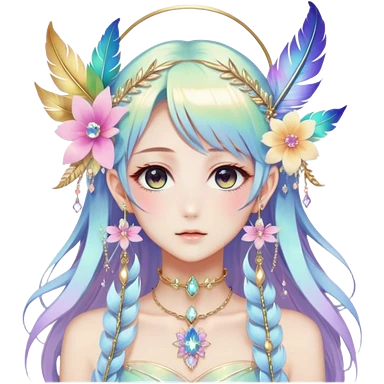 Beautiful gorgeous anime lady with beautiful iridescent-special-hair, fashion aesthetic, ethereal, fairycore, pastelcore, feather, flower, crystals, accessories, jewelries, gold, colorful emoji