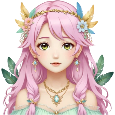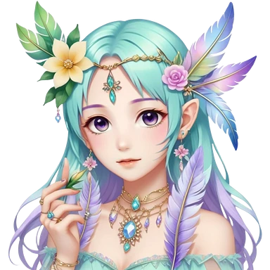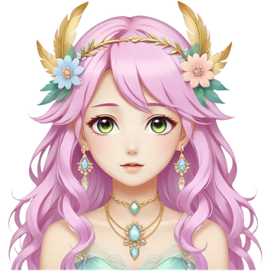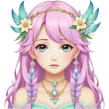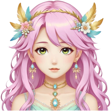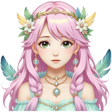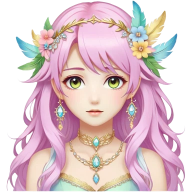 Beautiful gorgeous anime lady with beautiful pastel-special-hair, fashion aesthetic, ethereal, fairycore, pastelcore, feather, flower, crystals, accessories, jewelries, gold, colorful, laurel emoji