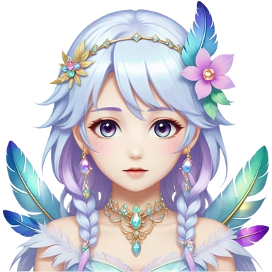 Beautiful gorgeous anime lady with beautiful iridescent-white-special-hair, fashion aesthetic, ethereal, fairycore, pastelcore, feather, flower, gems, accessories, jewelries, gold, colorful emoji