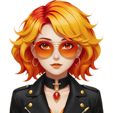 Beautiful gorgeous anime lady with beautiful fiery long warm-red-orange-yellow-gradient-wavy-special-hair, fashion aesthetic, slim red-tinted-sunglasses, accessories, gold jewelries, red-and-yellow sunny-pattern-eyes, black latex-suit, biker-woman, cool, badass, gold-sun-shaped-earrings, ahogeemoji