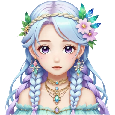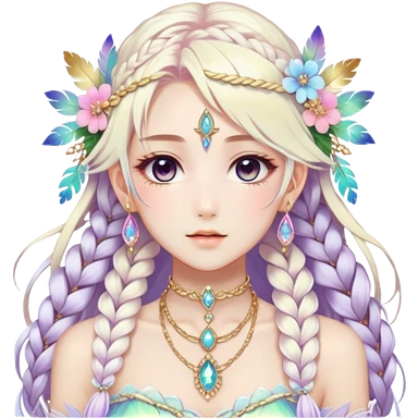 Beautiful gorgeous anime lady with beautiful iridescent-braided-hair, fashion aesthetic, ethereal, fairycore, pastelcore, feathers, flowers, gems, accessories, jewelries, gold, colorful emoji