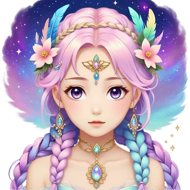 Beautiful gorgeous anime lady with beautiful iridescent-nebula-braided-hair, fashion aesthetic, ethereal, fairycore, pastelcore emoji