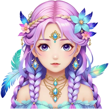 Beautiful gorgeous anime lady with beautiful iridescent-nebula-braided-hair, fashion aesthetic, ethereal, fairycore, pastelcore, feather, flowers, gems, accessories, jewelries, gold, colorful emoji