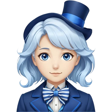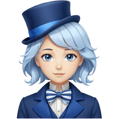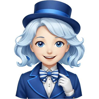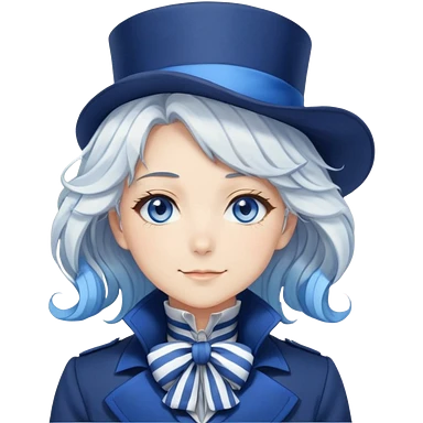 Beautiful gorgeous anime lady with white wavy hair with thin blue stripes, blue eyes, blue short top hat with a blue bow tie, smug smirk, laughing, happy, blue coat, blue cravat, white gloves emoji | AI Emoji Generator