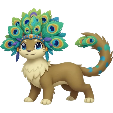 beautiful handsome gorgeous aesthetic colorful vibrant Vernid-Trico-species-Fakemon-creature by LiLaiRa, 4 legs, 1 tail, random markings, (full body) with a peacock-like-feather-headdress emoji