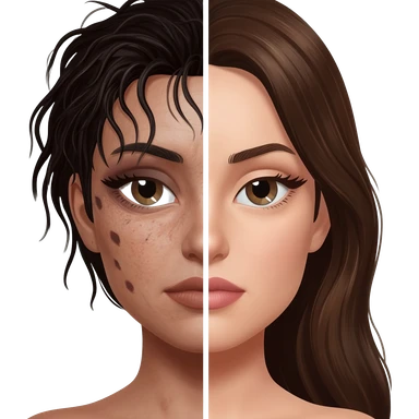 Split face woman: left side tired and messy with acne, dark circles and unkempt hair, right side beautiful with smooth skin, styled hair and makeup, glow up transformation, realistic portrait. emoji